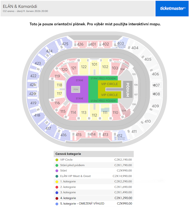 Vstupenky do O2 areny oficiálně prodává společnost Ticketmaster Česká republika, a.s. (Ticketmaster). Pokud vstupenku nakoupíte u jiných prodejců (vč. nákupu od jiných diváků), za jejich pravost a platnost pořadatel neodpovídá, přičemž jejich zakoupením riskujete, že nebudete vpuštěni do haly. Prodej vstupenek u oficiálního prodejce se dále řídí jeho Obchodními podmínkami. V případě nutnosti nákupu vstupenky, vyžadující specifické technické podmínky umístění zákazníka (např. pro ZTP/P), se prosím před nákupem vstupenky nejdříve obraťte na prodejce vstupenek s ověřením možnosti splnění takových podmínek pro konkrétní akci.
