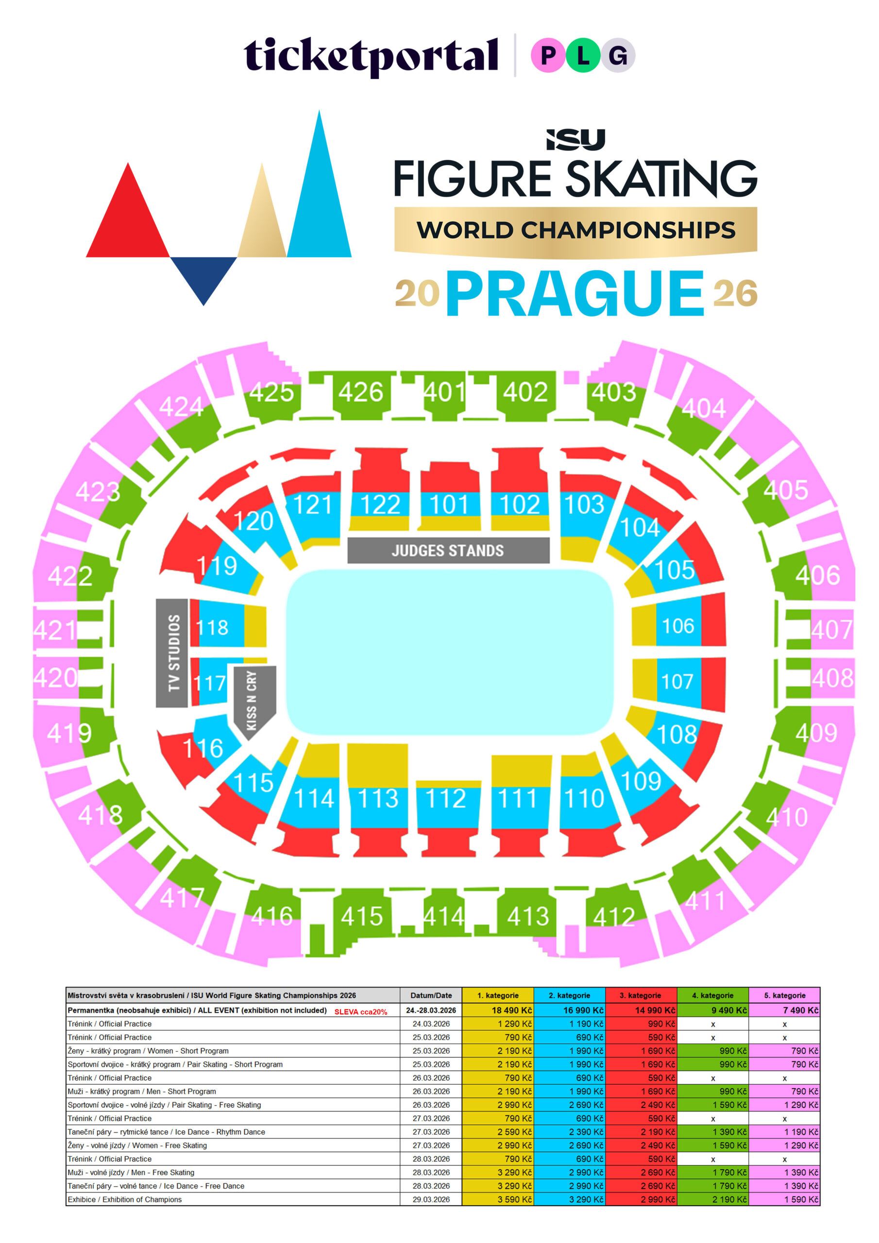Tickets are available in five price categories from Ticketportal and Ticketmaster, with prices starting from 790 CZK for Short Program and 1,290 CZK for the Free Skating. Up to six tickets for single-sessions and four all-event tickets can be purchased in one transaction (Ticketportal) and up to six tickets for single-sessions (Ticketmaster).