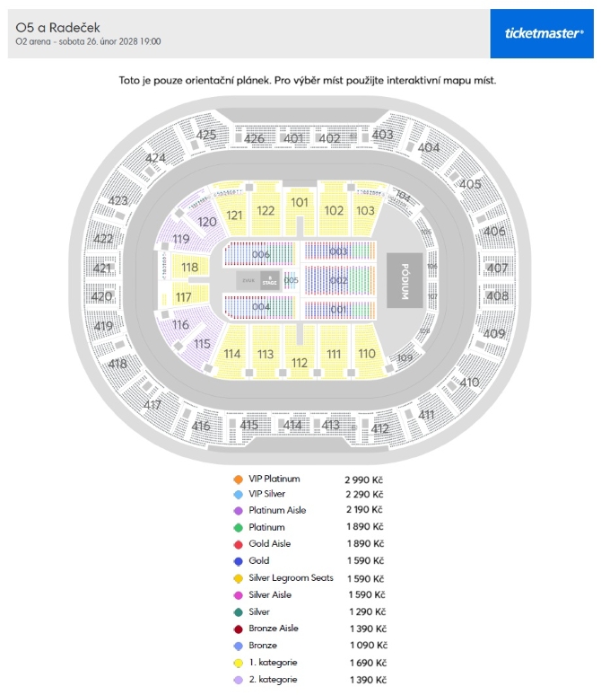 Akce: Datum a čas akce mohou být změněny s upozorněním na webové stránce akce (www.o2arena.cz). Změna místa konání akce je vyhrazena, přičemž akce může být, bez dalšího nároku držitele vstupenky, dle rozhodnutí pořadatele, přesunuta do tzv. O2 universa (budova č. p. 2345, na adrese Českomoravská 2345/17, Praha 9).