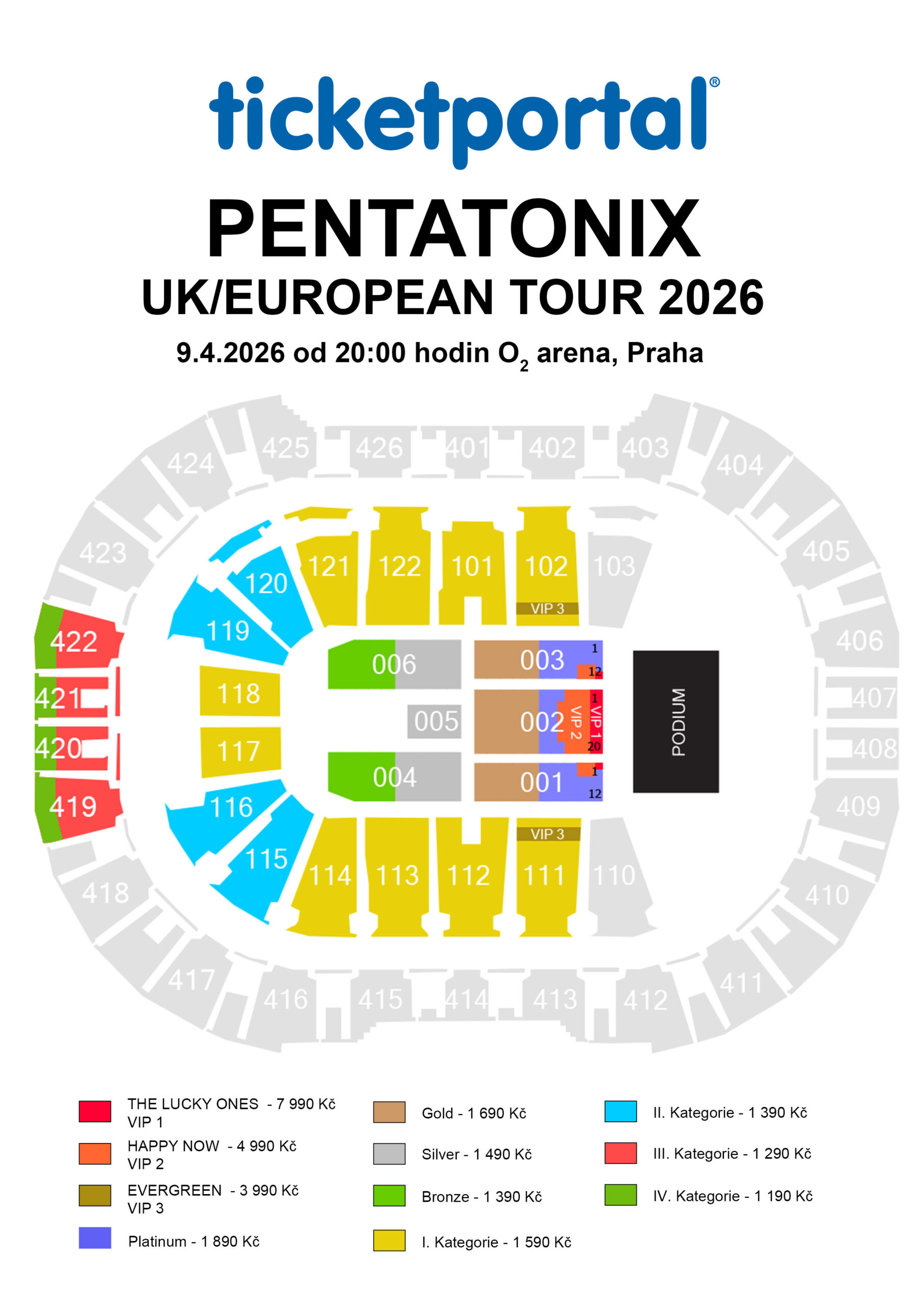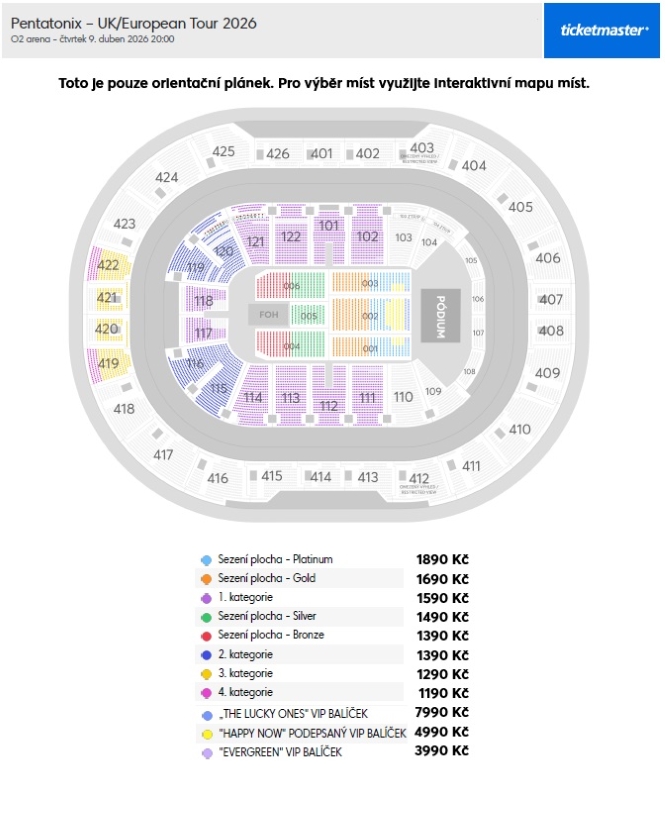 Vstupenky do O2 areny oficiálně prodává společnost Ticketmaster Česká republika, a.s. (Ticketmaster). Pokud vstupenku nakoupíte u jiných prodejců (vč. nákupu od jiných diváků), za jejich pravost a platnost pořadatel neodpovídá, přičemž jejich zakoupením riskujete, že nebudete vpuštěni do haly. Prodej vstupenek u oficiálního prodejce se dále řídí jeho obchodními podmínkami. V případě nutnosti nákupu vstupenky, vyžadující specifické technické podmínky umístění zákazníka (např. pro ZTP/P), se prosím před nákupem vstupenky nejdříve obraťte na prodejce vstupenek s ověřením možnosti splnění takových podmínek pro konkrétní akci.
