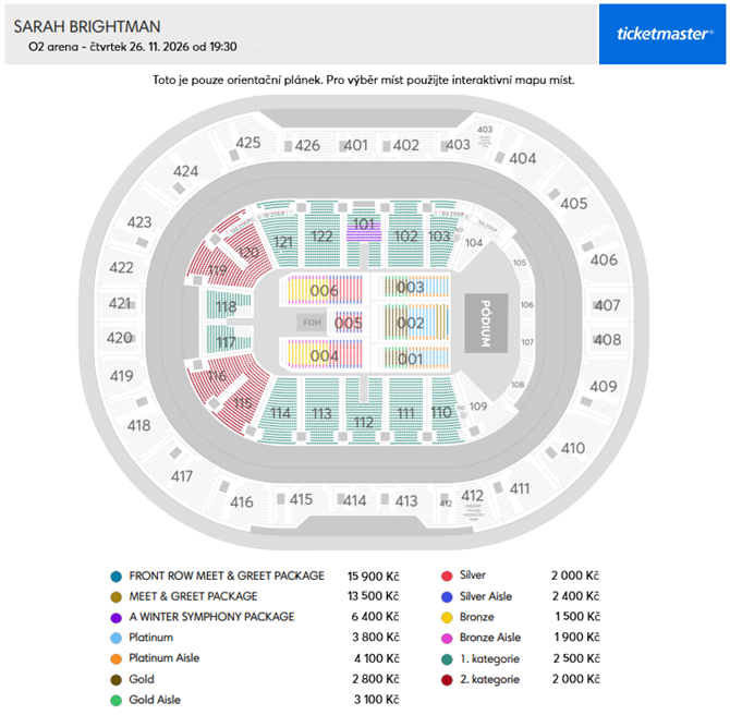 Vstupenky do O2 areny oficiálně prodávají pouze společnosti IRSnet CZ s.r.o. (Ticketportal) a Ticketmaster Česká republika, a.s. (Ticketmaster). Pokud vstupenku nakoupíte u jiných prodejců (vč. nákupu od jiných diváků), za jejich pravost a platnost pořadatel neodpovídá, přičemž jejich zakoupením riskujete, že nebudete vpuštěni do haly. Prodej vstupenek u oficiálních prodejců se dále řídí jejich obchodními podmínkami, které lze nalézt na jejich webových stránkách (https://www.ticketmaster.cz/, https://www.ticketportal.cz/).