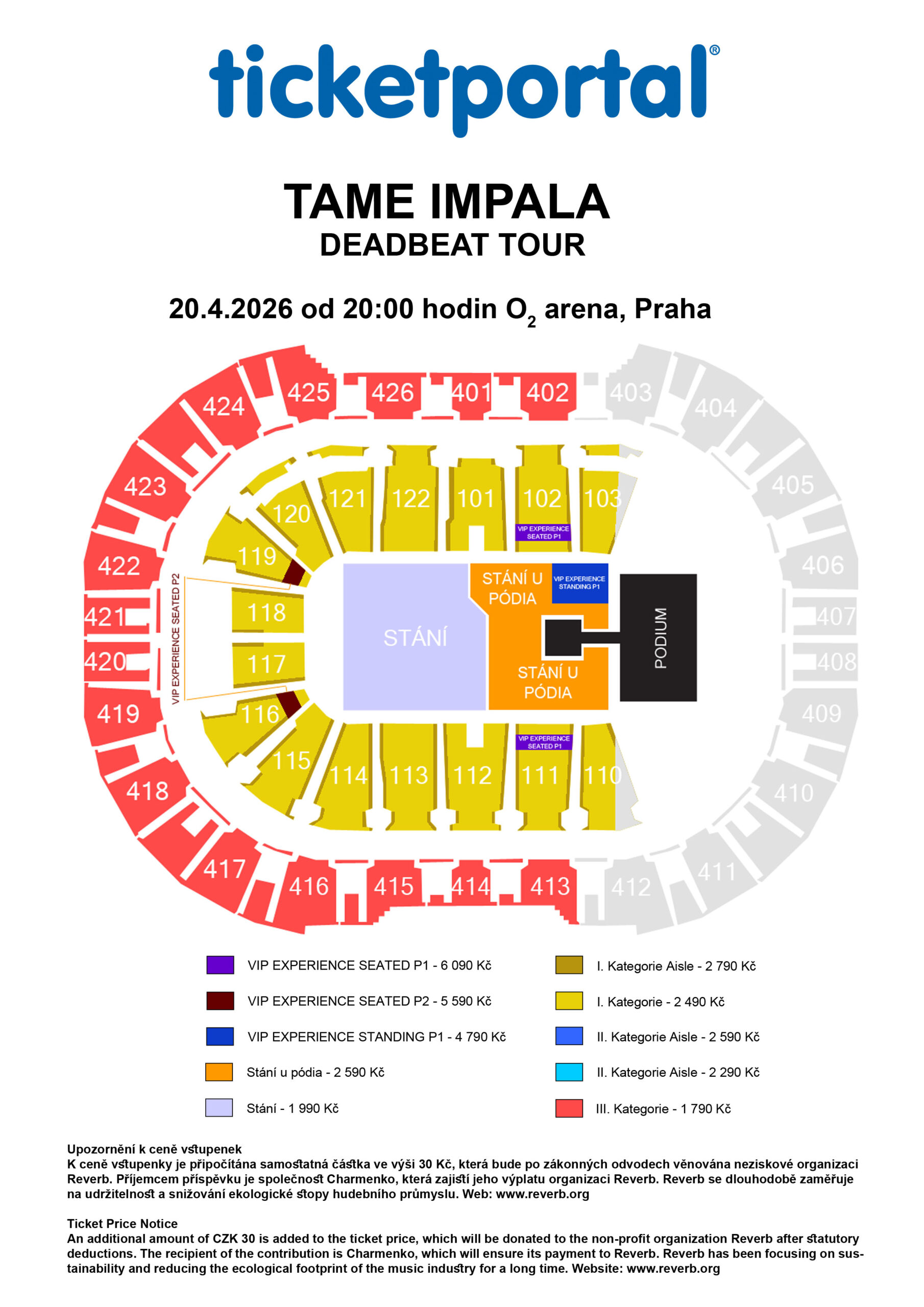 A mandatory surcharge of CZK 30 will be added to the ticket price. After statutory deductions, this amount will be donated to the non-profit organization Reverb, which has long been focused on sustainability and reducing the environmental impact of the music industry. Foundation website: www.reverb.org