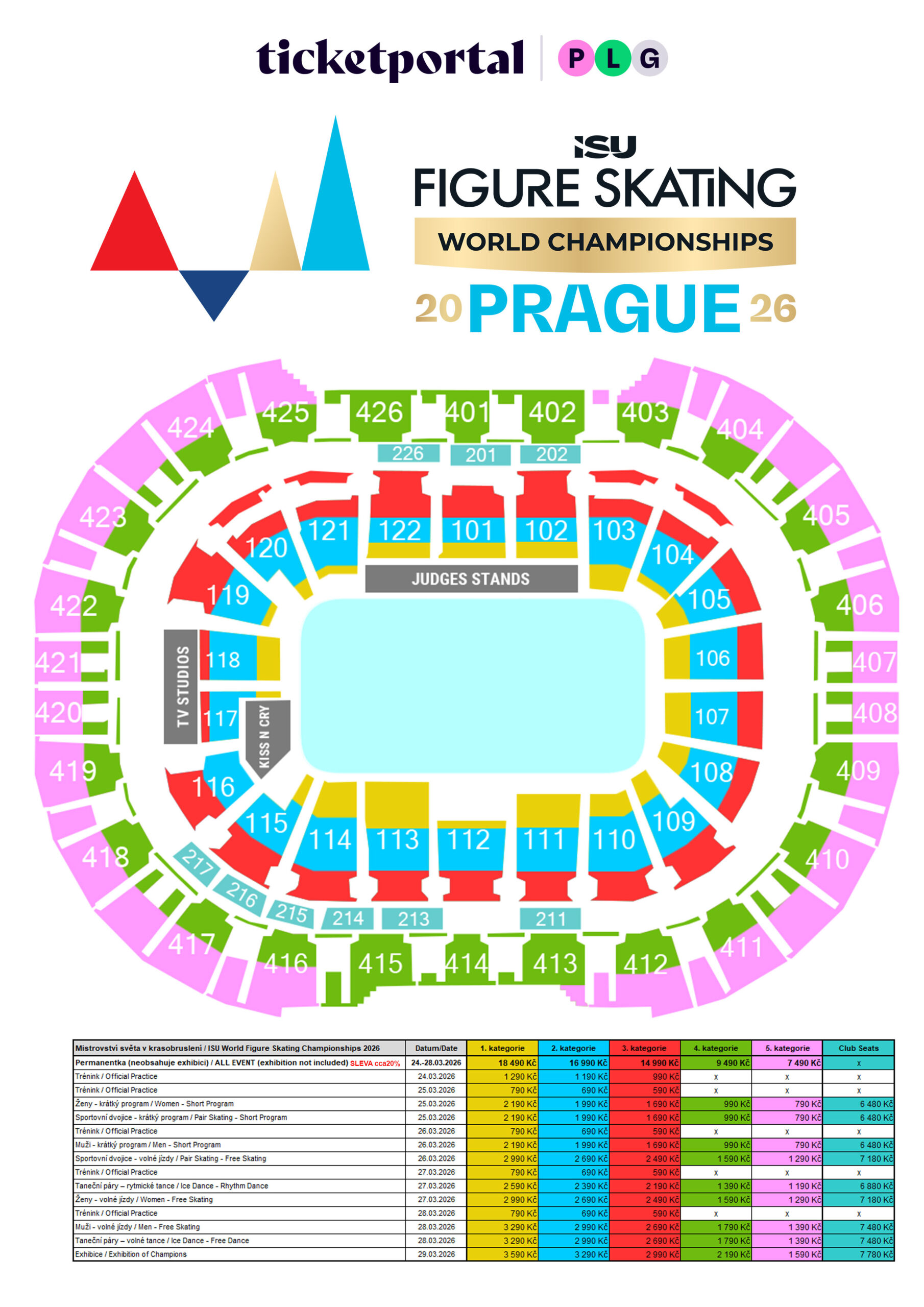 Vstupenky jsou k dispozici v pěti cenových kategoriích u společnosti Ticketportal a Ticketmaster – od 790 Kč za krátké programy, boje o světové medaile je možné zakoupit už za 1 290 Kč. Na jeden nákup bude možné zakoupit až 6 vstupenek na jednotlivé soutěže a 4 all-event vstupenky u společnosti Ticketportal, a až 6 vstupenek na jednotlivé soutěže u společnosti Ticketmaster.