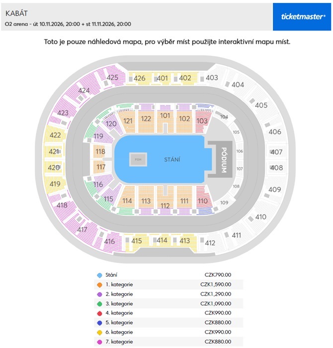 880 – 1 590 Kč Vstupenky pro držitele průkazu ZTP/P vozíčkáře objednávejte u společností Ticketportal (rezervace@ticketportal.cz) a Ticketmaster (ticket@ticketmaster.cz). |