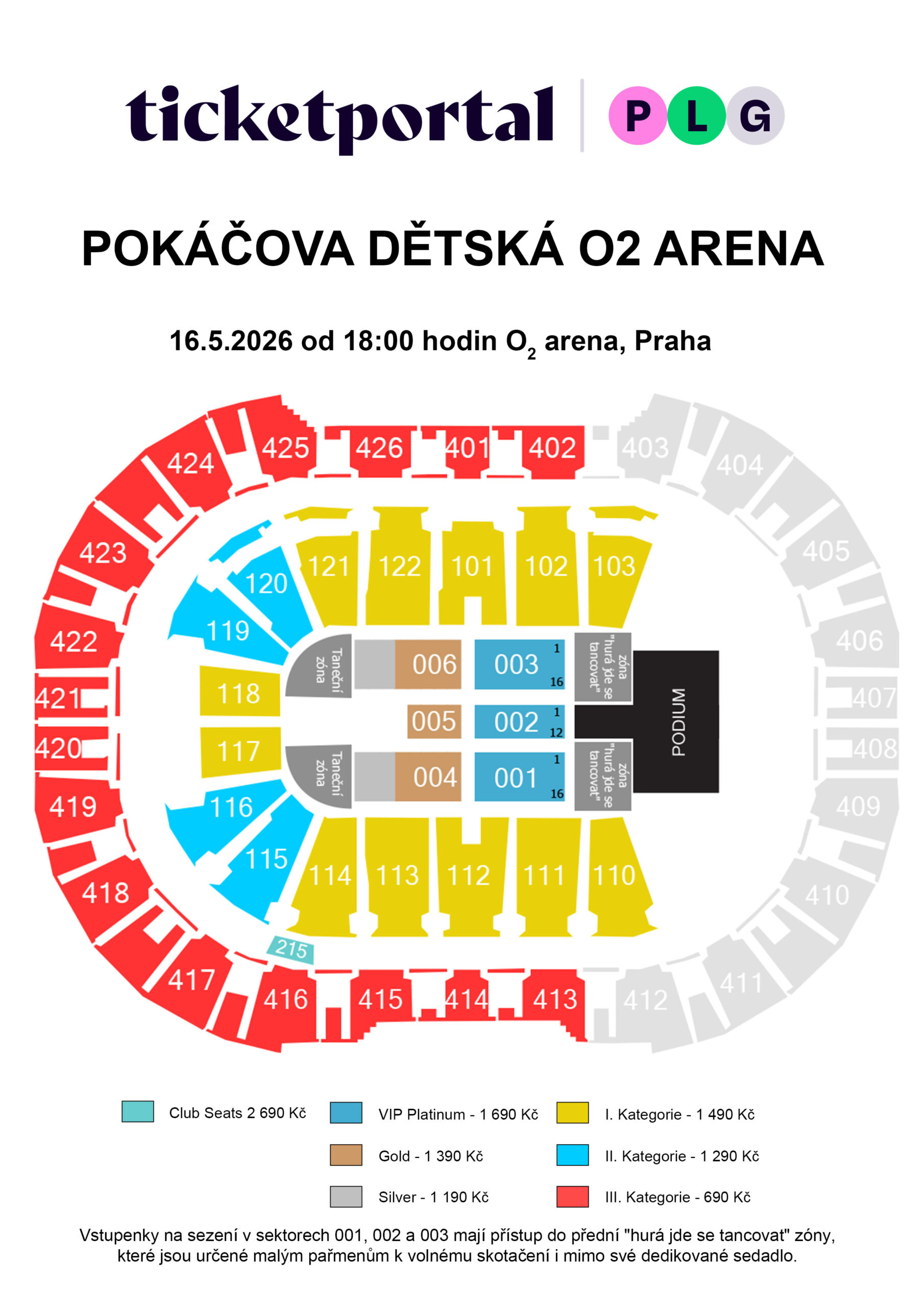 Ve všech tanečních zónách budou přítomny zkušené animátorky, které však nezajišťují dozor a dohled nad dětmi. Zároveň bychom rádi upozornili, že jednotlivé prostory, tedy Zóna „hurá, jde se tancovat“ a „taneční zóna“, budou odděleny zábranami, a to primárně z důvodu dodržení požárně-bezpečnostních pravidel O2 areny. V této souvislosti proto důrazně upozorňujeme, že pohyb mezi jednotlivými zónami nebude možný. Pro úplnost rovněž sdělujeme, že držitelům vstupenek do jiných sektorů než těch uvedených výše (tj. 001, 002, 003, 004, 005 a 006) nebude vstup do tanečních zón umožněn.