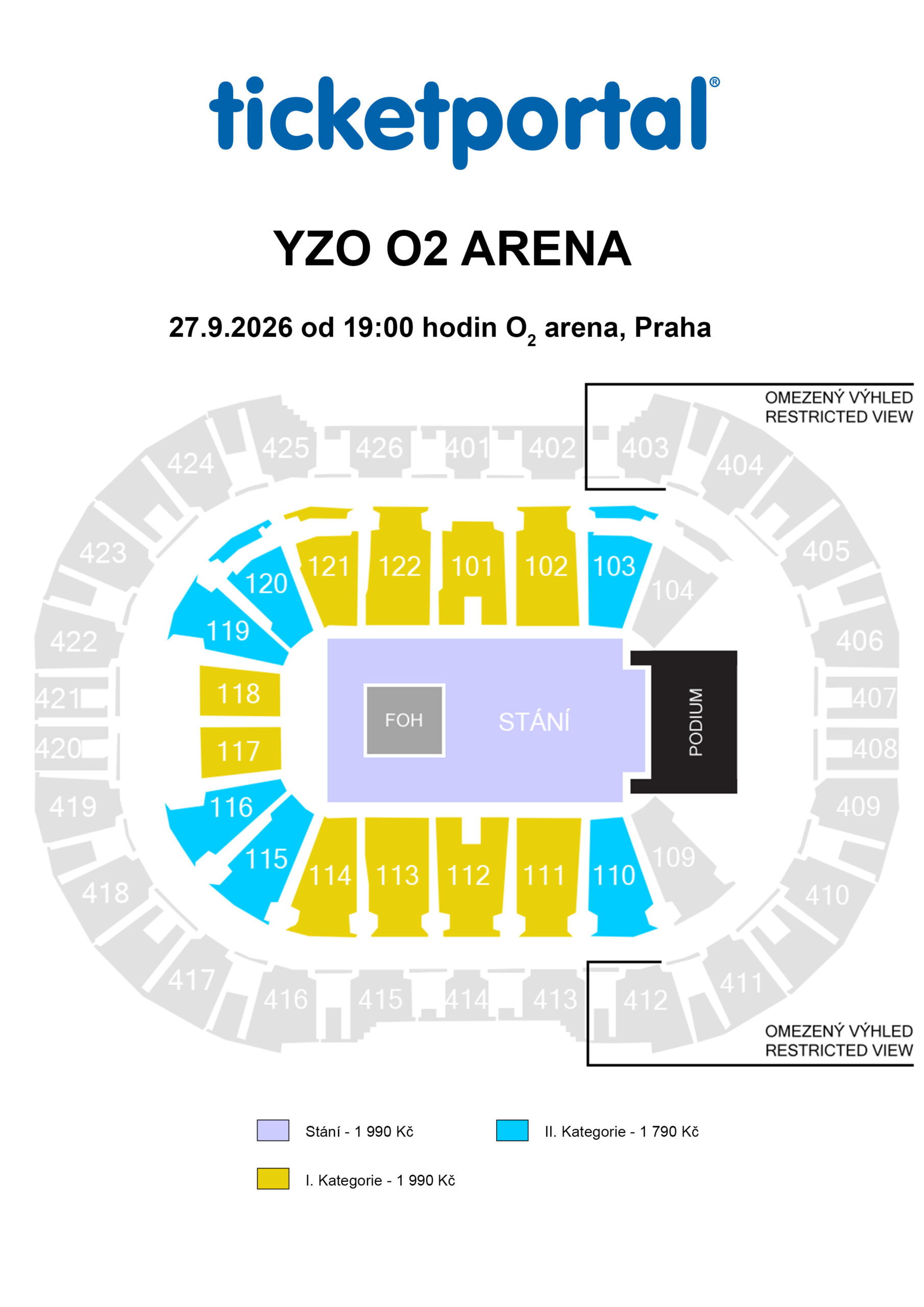 Akce: Datum a čas akce mohou být změněny s upozorněním na webové stránce akce (www.o2arena.cz). Změna místa konání akce je vyhrazena, přičemž akce může být, bez dalšího nároku držitele vstupenky, dle rozhodnutí pořadatele, přesunuta do tzv. O2 universa (budova č. p. 2345, na adrese Českomoravská 2345/17, Praha 9).
