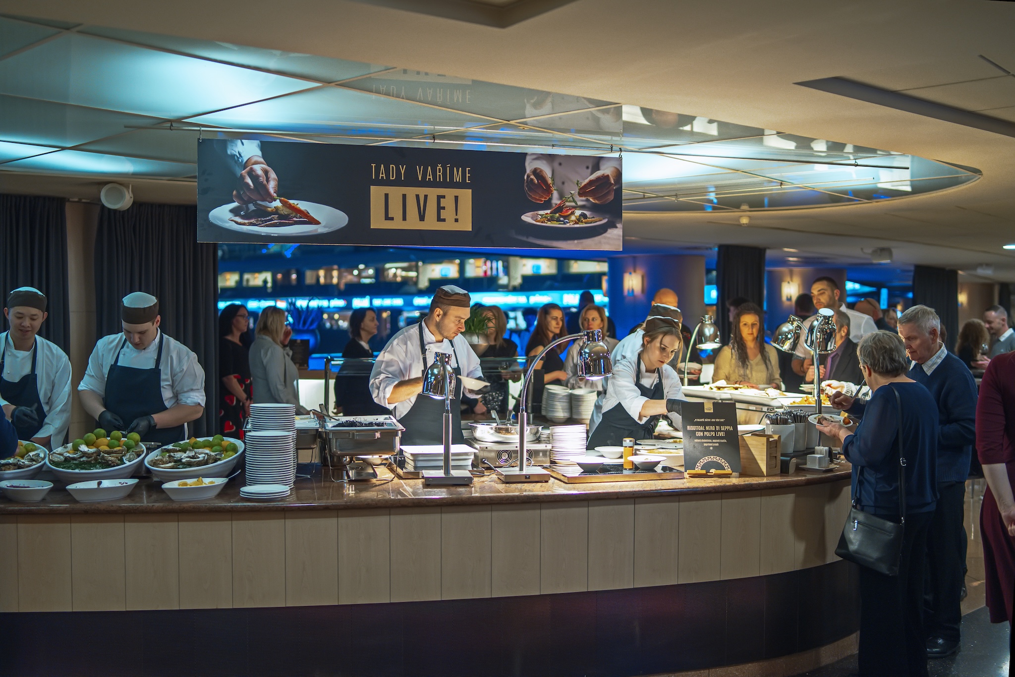 Hosté klubového patra si díky cateringu užívají každou akci bez kompromisů. Široké menu se připravuje z čerstvých surovin přímo v areně a podává se formou bufetů a oblíbených LIVE cooking stanic, kde šéfkuchaři dokončují pokrmy přímo před hosty. Atmosféru doplňuje sedm open barů, kde jsou podávány vybrané nápoje bez limitu. Během vybraných akcí navíc catering obohacují hostovská vaření předních českých restaurací, díky nimž se každý večer může stát malým gastronomickým svátkem.